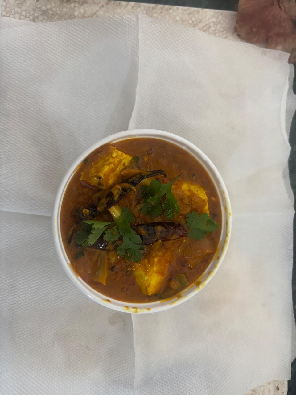 “Cubes of fresh paneer stir-fried with crunchy bell peppers, onions, and tomatoes in a spicy, semi-dry masala.”