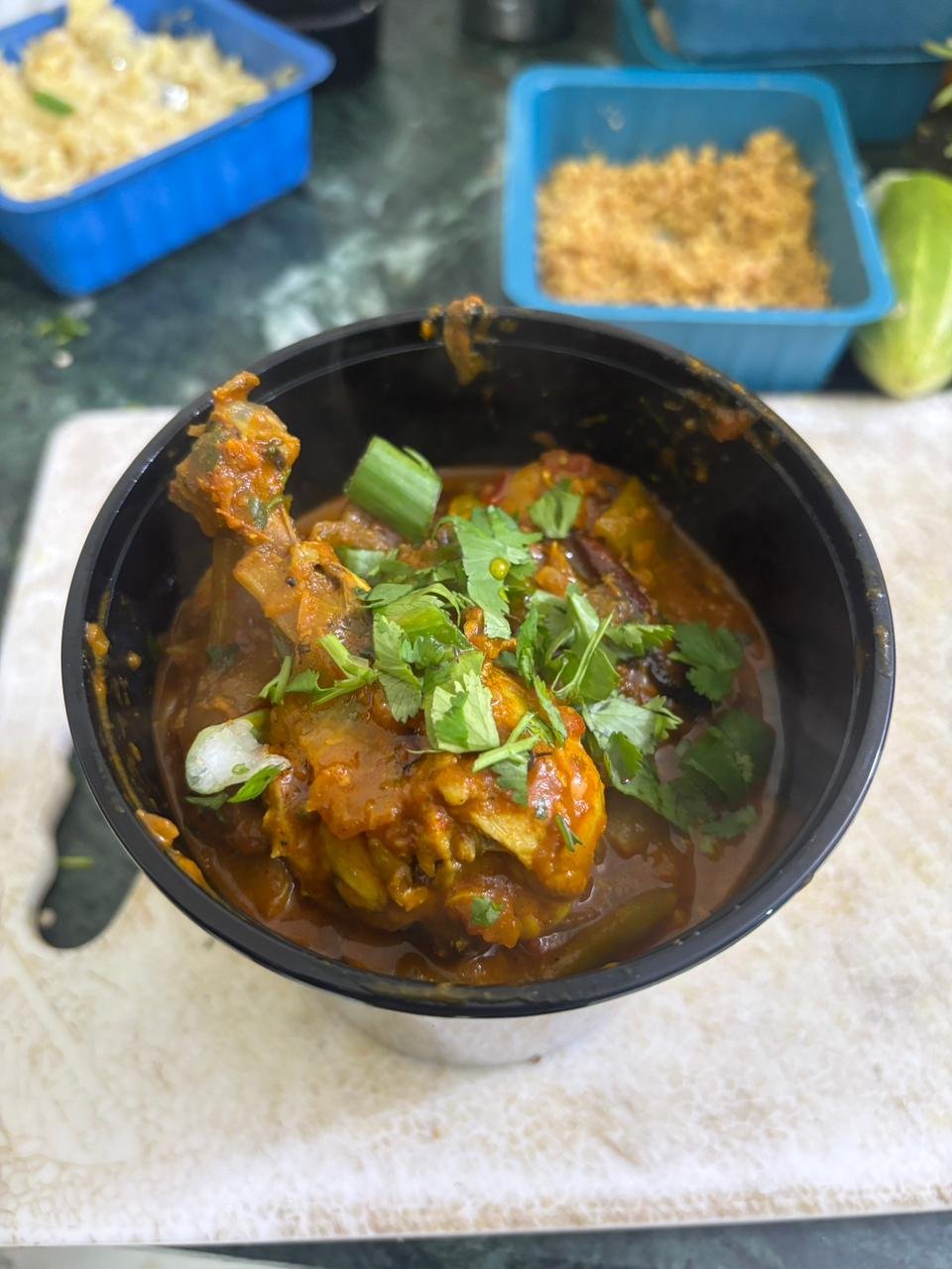 “Chicken pieces wok-tossed with chunks of fresh bell peppers, onions, and tomatoes in a thick, spicy gravy.”